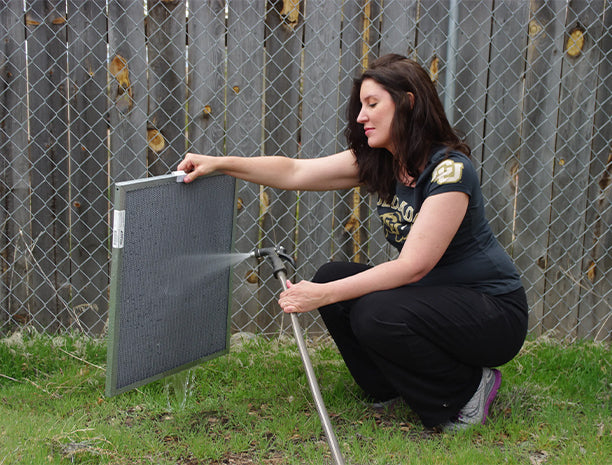 Our permanent filters are easy to clean. They can be cleaned with water, with a vacuum or air washed with an air compressor. We recommend vacuuming the filter off every 30-45 days and washing it with water every 3-4 months. No special cleaners are generally needed. However, if the filter is exposed to cigarette smoke or cooking fumes, a mild degreaser can be sprayed on the dirty side of the filter and then hosed off thoroughly from the clean side of the filter. The filter can also be washed in a tub or shower. We do not recommend washing it in a dishwasher as the excessive heat will damage the media in the filter.